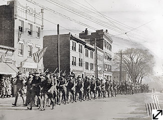 Greenwich and Sound Beach Home Guard Units Marching Up Greenwich Avenue. Winter 1918.Photograph. Greenwich Historical Society, William E. Finch, Jr. Archives, Photograph Collection.
