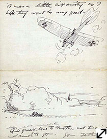 In this letter to his son, Twachtman described what he had drawn: “German machine came over and directed the fire of a battery on one of my batteries and the shells came very close. Then he saw some of my men pushing a little hand car of shells across a field and he turned right up on his nose and fired on them with his machine gun.”