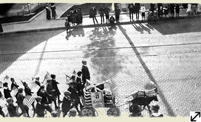 The poster The Hun—His Mark Blot It Out can be seen being carried in the parade.