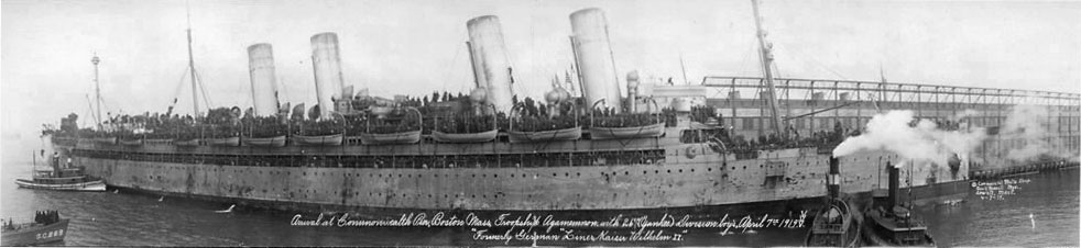 Arrival at Commonwealth Pier, Boston, Mass. Troopship Agamemnon with 26th (“Yankee”) Division boy’s, April 7th, 1919. Formerly German “Liner Kaiser Wilhelm II.” Commercial Photo Shop, George M. Russell Mgr., Lowell, Mass. Library of Congress, LC-US62-52796.